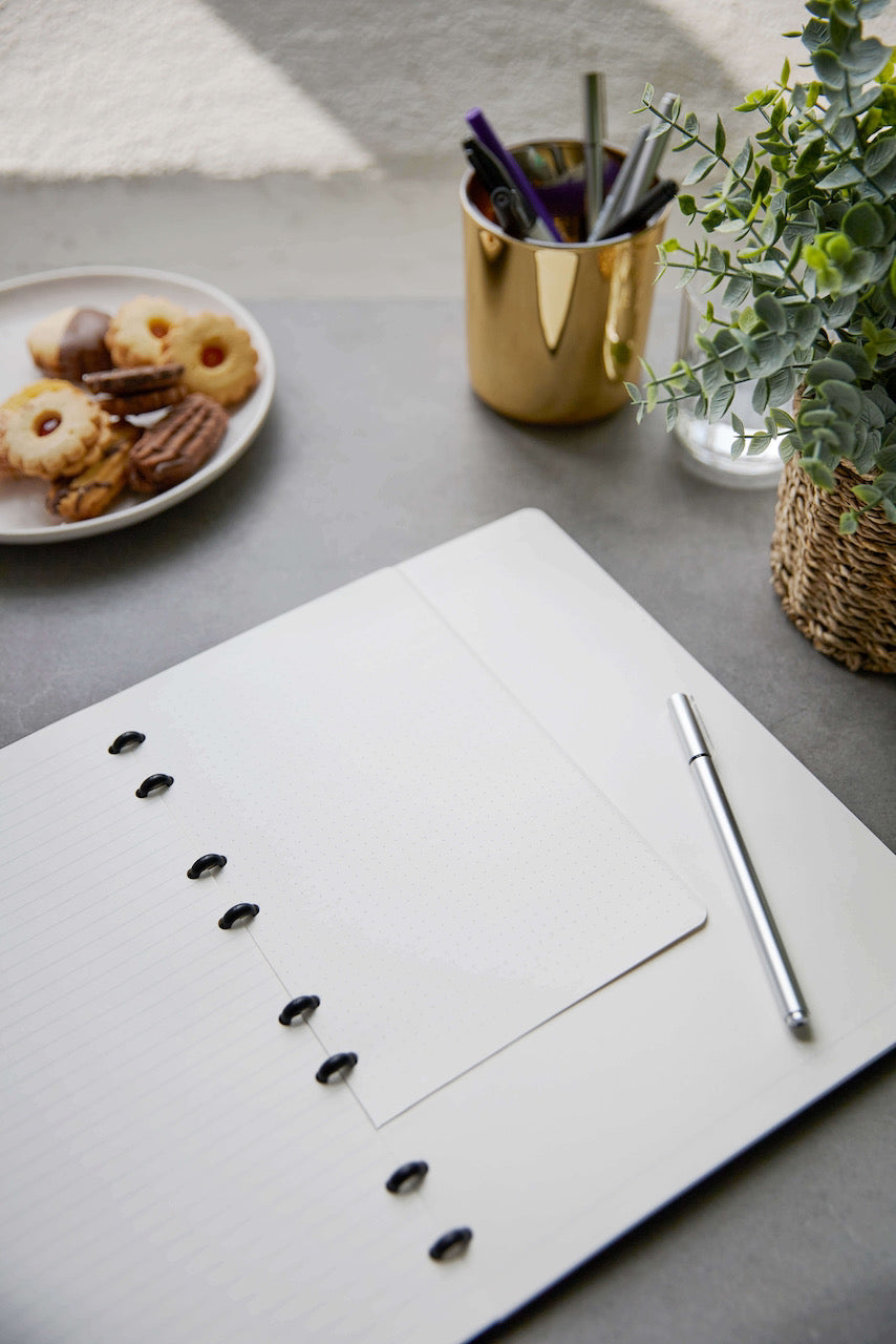 Grâce à sa reliure unique en forme de « U », Minbøk est le seul carnet rechargeable qui permet de réorganiser le contenu de votre carnet tout en gardant l’esthétique épurée d’un carnet de notes traditionnel contrairement aux autres carnets à disques.